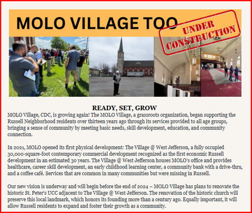 “MOLO” means “welcome” in Xhosa (a South African dialect); at MOLO Village, everyone is welcome to add their own contributions since “it takes a village.” MOLO’s inclusive village consists of five “hamlets,” (or programmatic areas) each with a unique focus that grows a community of healthy, engaged and productive residents preparing to take their families and their neighborhood on a path to prosperity.